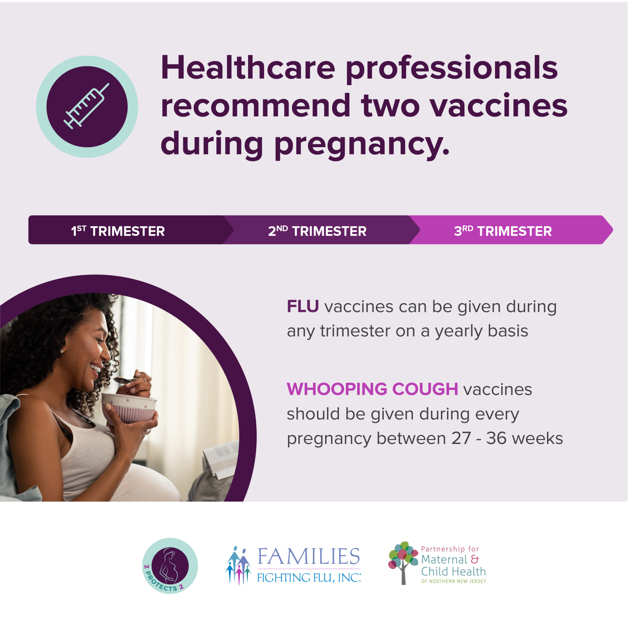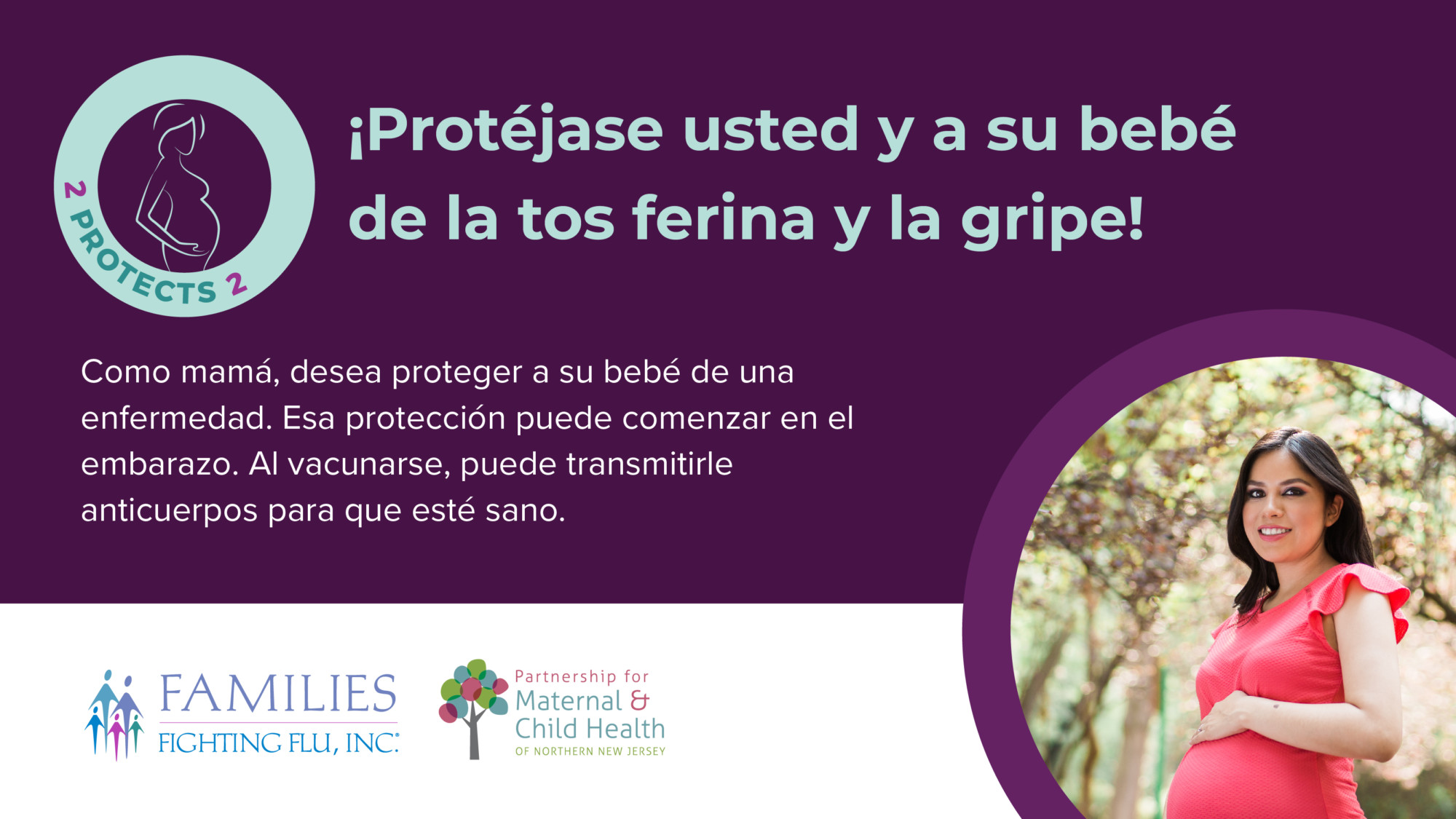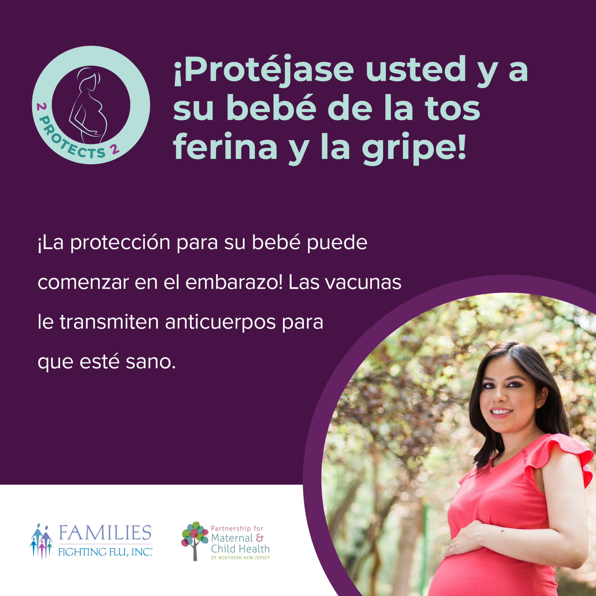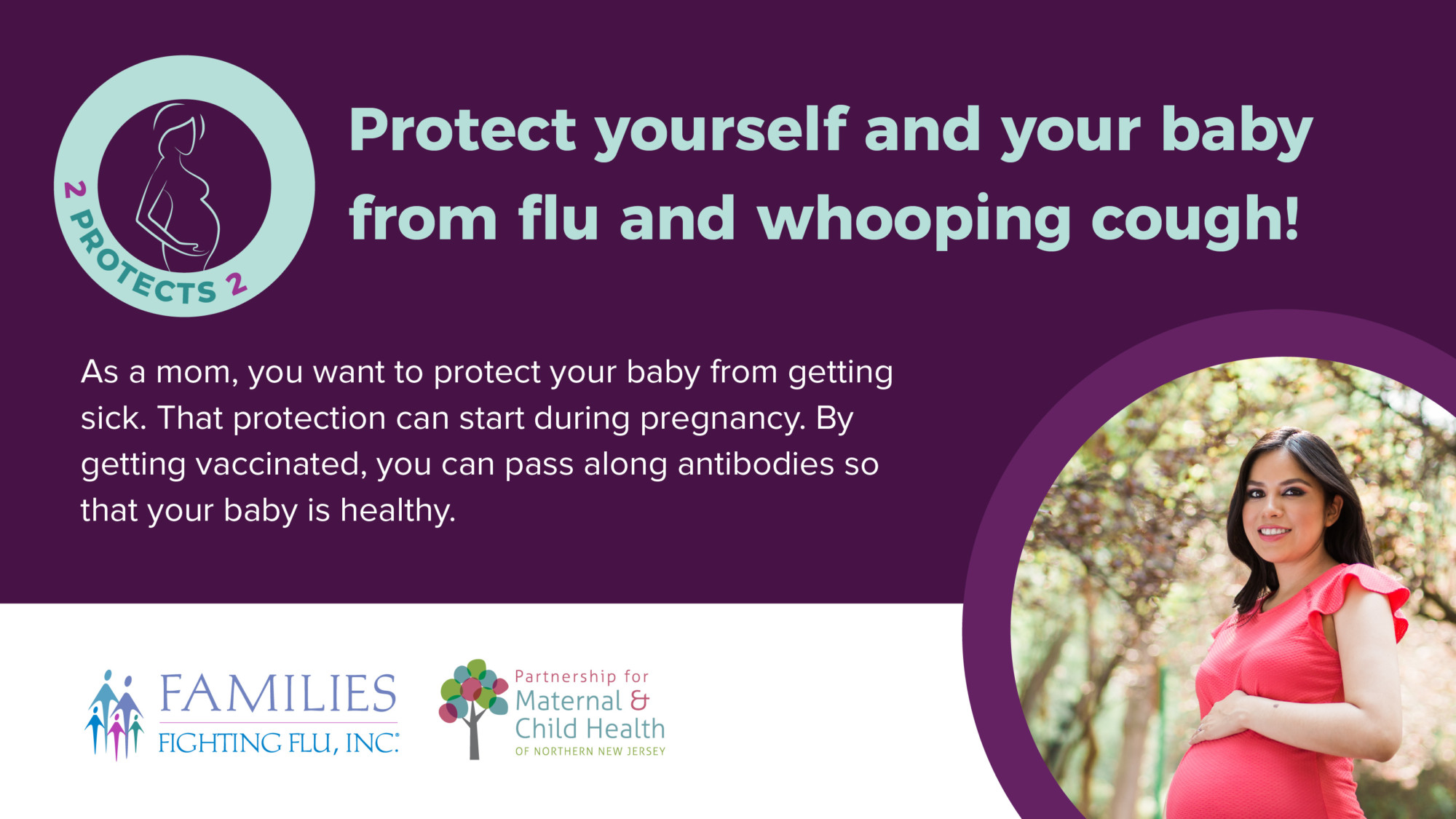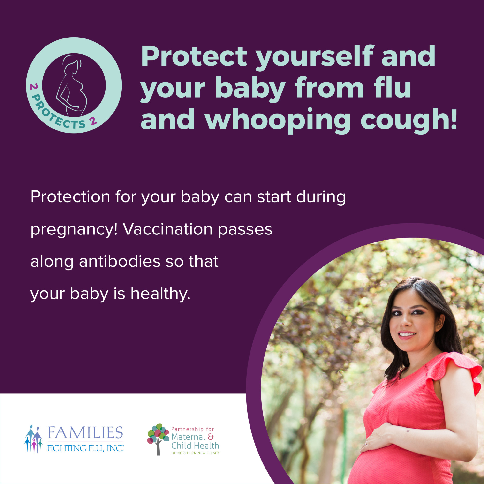 2 Protects 2 is a collaborative educational program between Families Fighting Flu and the Partnership for Maternal and Child Health of Northern New Jersey aimed at increasing public awareness about the importance of influenza (flu) and pertussis (whooping cough) vaccinations for pregnant women.