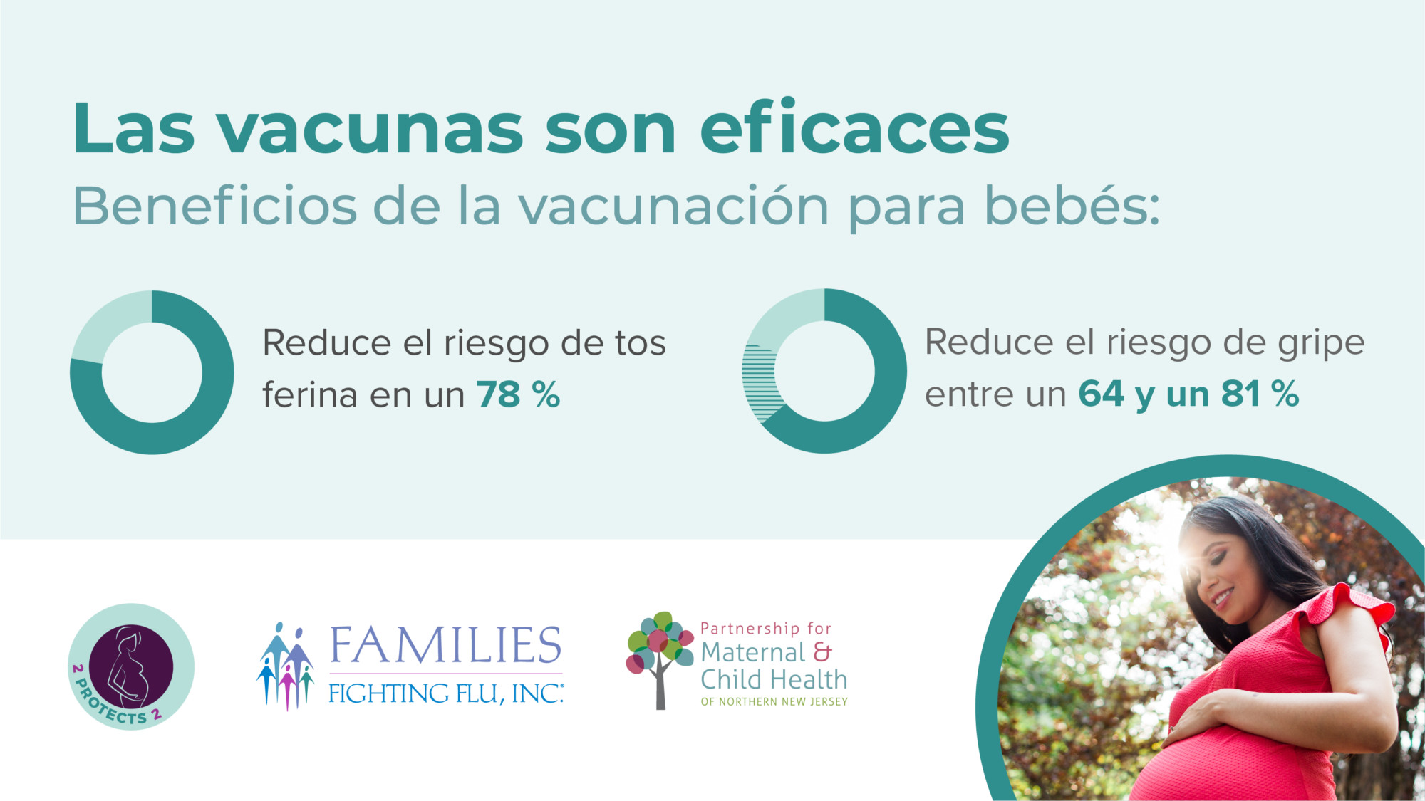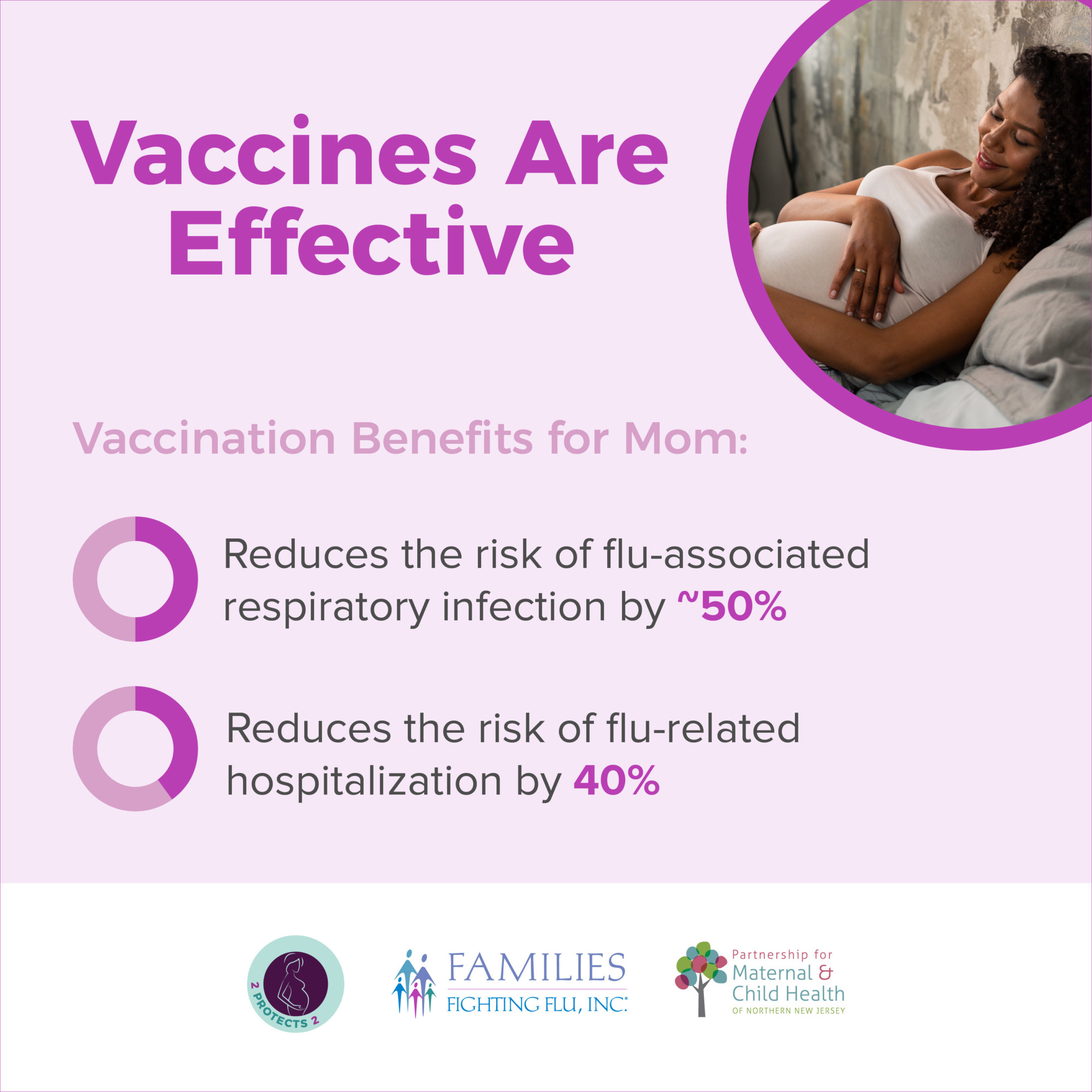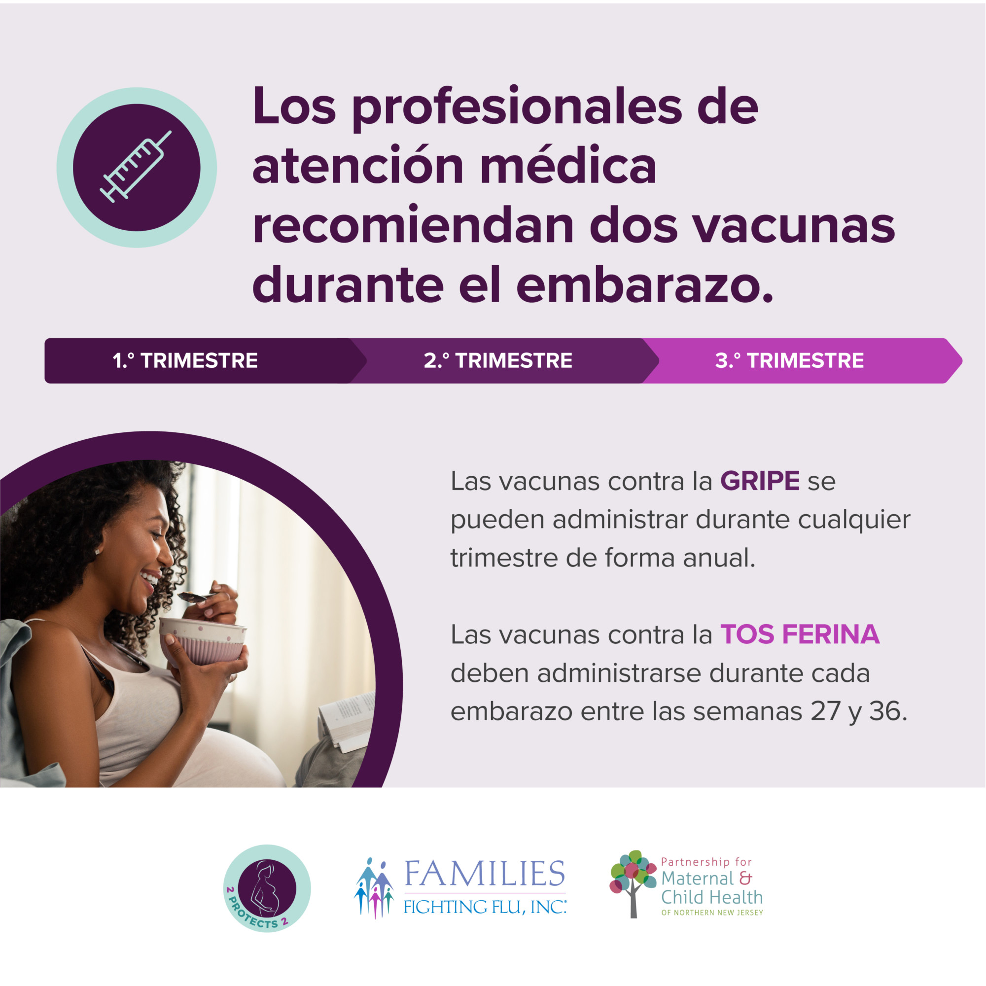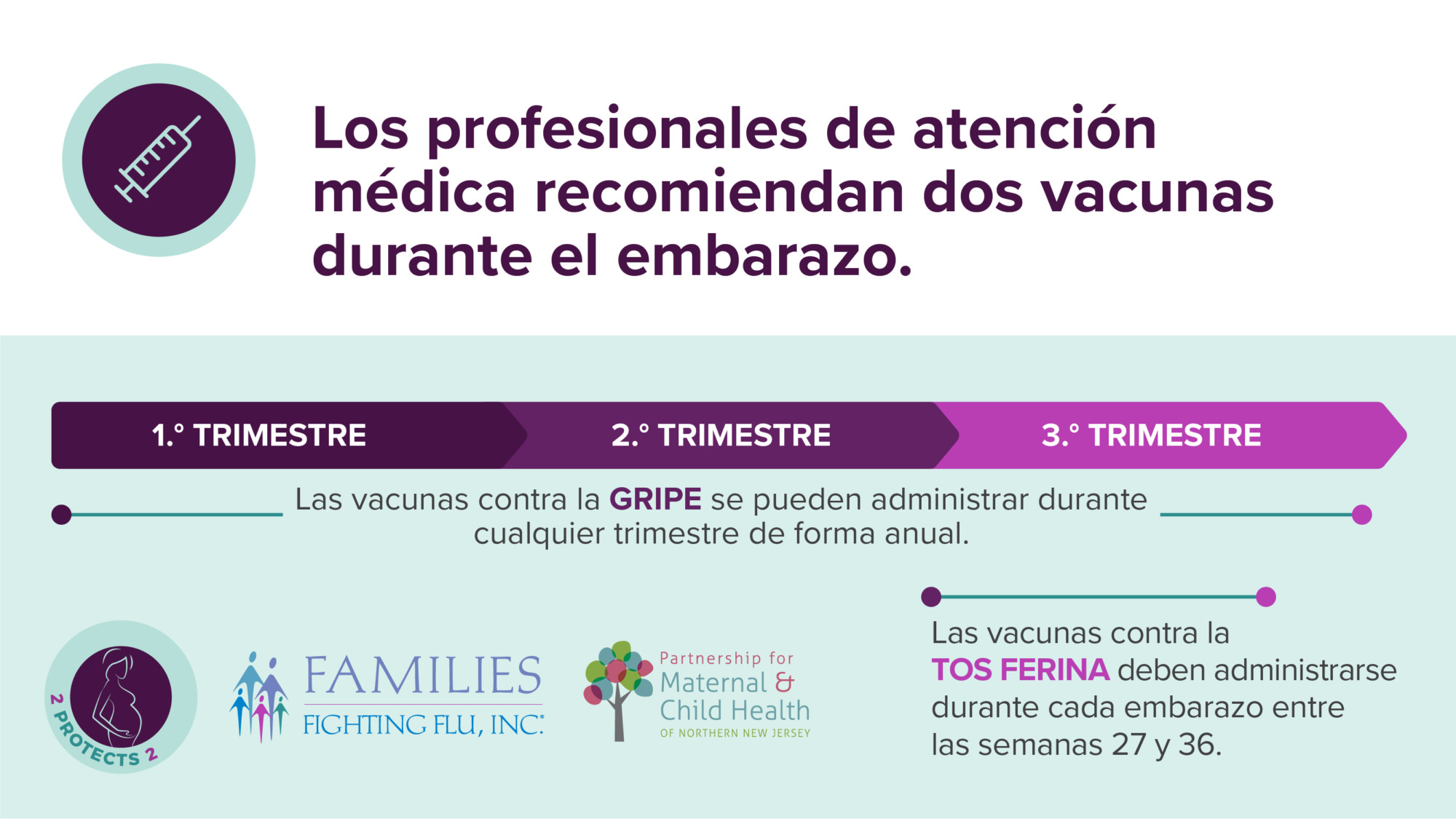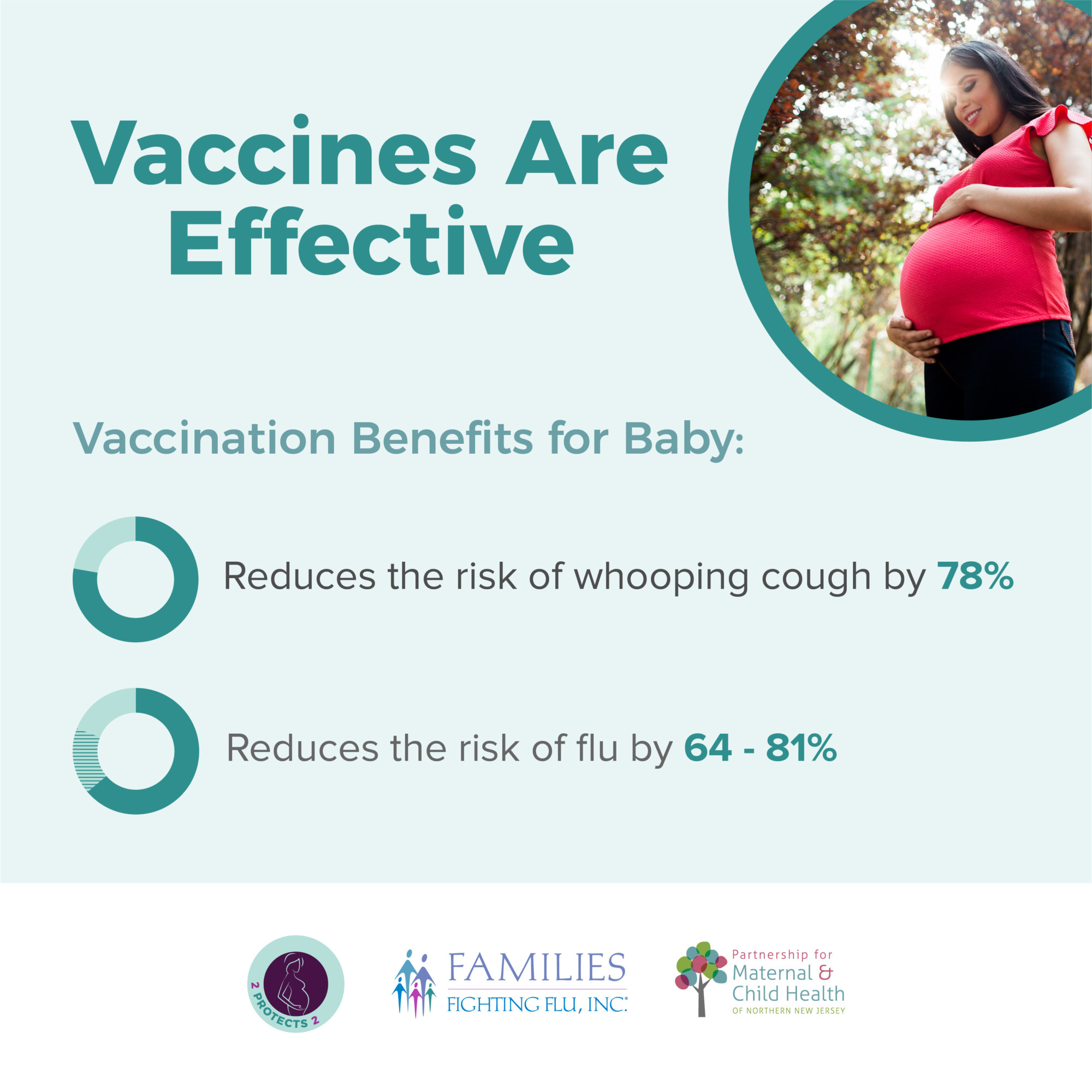 2 Protects 2 is a collaborative educational program between Families Fighting Flu and the Partnership for Maternal and Child Health of Northern New Jersey aimed at increasing public awareness about the importance of influenza (flu) and pertussis (whooping cough) vaccinations for pregnant women.